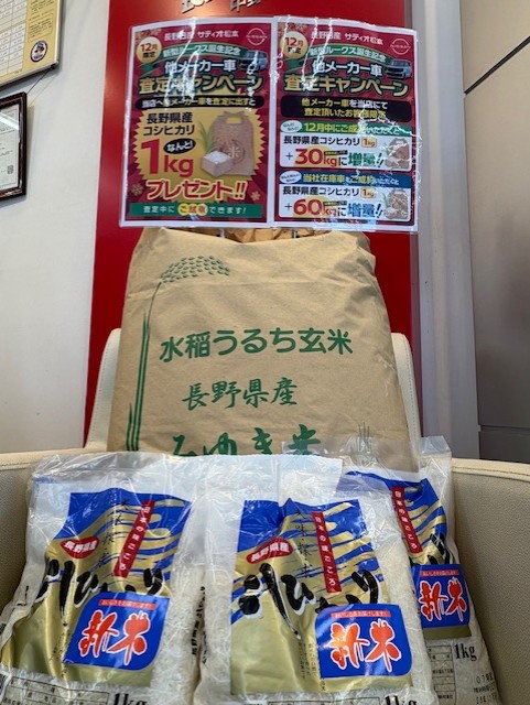 他メーカー車・査定キャンペーン 2025年12月06日|中野店 こんにちは。中野店です 長野日産では 他メーカー車の査定キャンペーンを実施中 ど・ど~~んと新米1㎏プレゼント 長野県産コシヒカリです さらに 12月中に日産車新車のご成約となった場合(査定のお車を下取り)は 新米を30㎏ 当社在庫新車ご成約の場合は 新米を60㎏ プレゼントしちゃいます 日産車にお乗り頂いてる皆様も ご家族で他メーカー車を所有していたら ぜひ、ご家族皆様で査定にお越しくださいませ Visited 9 times, 9 visit(s) today