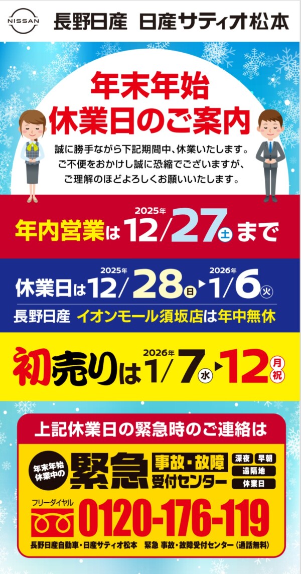 年末のお知らせ 2025年12月21日|中野店 こんにちは。中野店です いよいよ年末まで10日を切りました。 25日はクリスマス🎄もあり 年末まで何かとせわしいですが 体調にきをつけて頑張りまっしょい! 長野日産の年末年始のお休みは下記のようになります 27日まで通常営業しています ご心配事は今のうちにご連絡を。 宜しくお願いいたします Visited 18 times, 18 visit(s) today