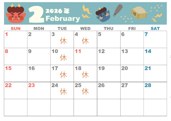 2月のお休みのお知らせです