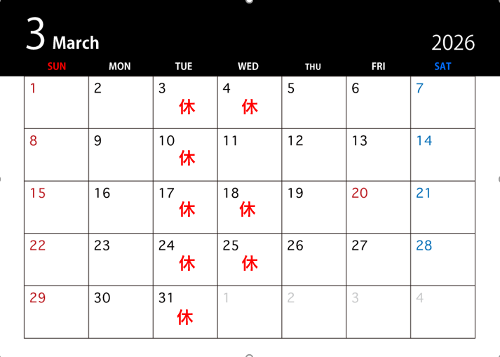 毎週火曜日と4日、18日、25日の水曜日が定休日となります