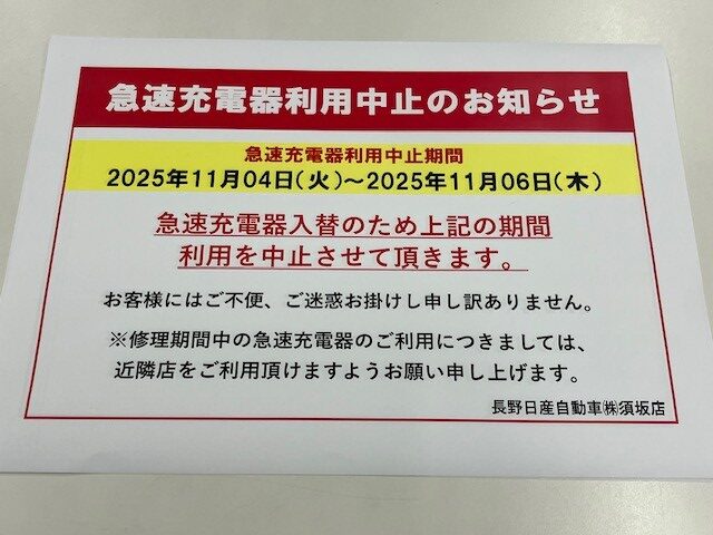 急速充電器ご利用の方へ 2025年11月03日|須坂店 こんにちは 須坂店です 当店に設置されている急速充電器が リニューアル工事のため 11月4日(火)から11月6日(木) の期間ご利用を中止させていただきます。 ご不便、ご迷惑ををお掛けし申し訳ありません。 期間中の急速充電器のご利用につきましては 近隣店舗をご利用いただきますようお願い申し上げます。 Visited 17 times, 17 visit(s) today