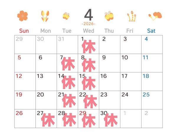 4月のお知らせ📢 2026年04月03日|須坂店 こんにちは🌼 須坂店です! いよいよ新年度がスタートしましたね! サクラも咲き始め、すっかり春ですね♪ 4月の定休日のお知らせです📢 4月は、毎週火曜日と水曜日 27日から5月1日まで がお休みです。 ご不便をおかけいたします。 事故・故障でお困りの方は 緊急事故・故障受付センターへご連絡ください。 0120-176-119 Visited 15 times, 15 visit(s) today