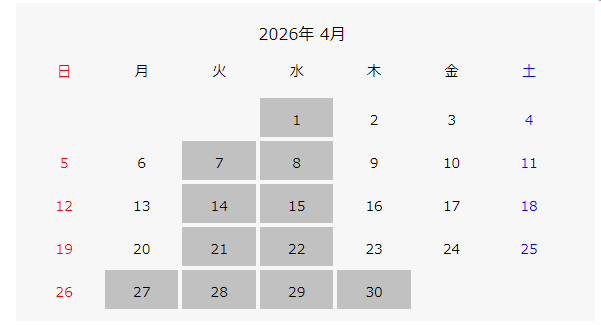 4月より定休日が変わりまして、毎週火・水曜日になります