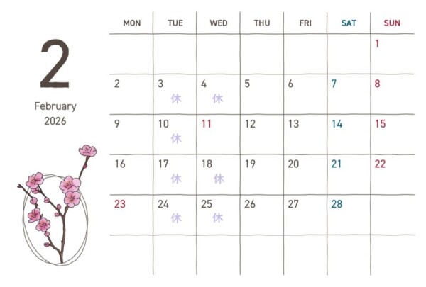 2月の定休日は毎週火曜日と第1・3・4水曜日です!