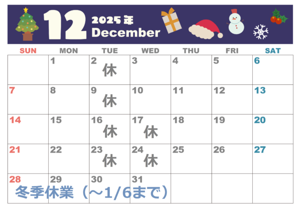 🌟12/28(日)~1/6(火)までは冬季休業となります🌟