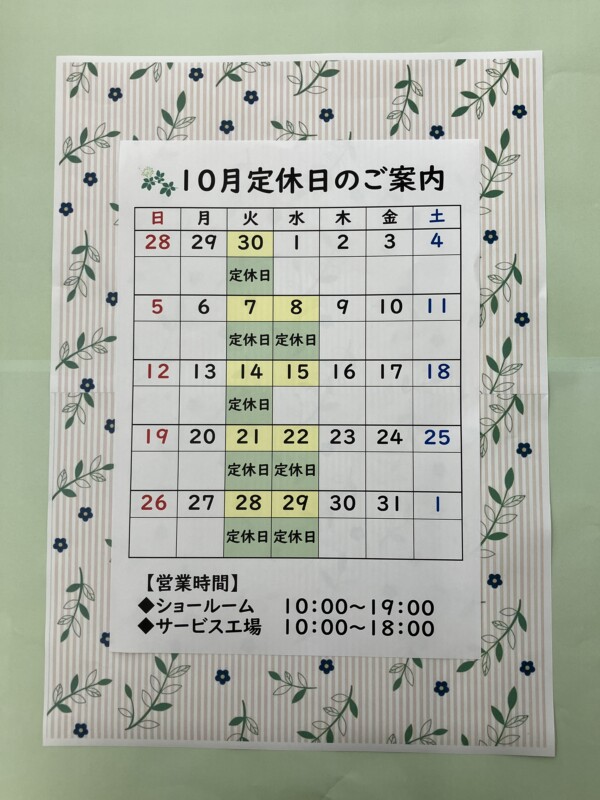 10月のお知らせ 2025年10月13日|岡谷店 こんにちは 岡谷店です。 今日はすっきりしないお天気ですね。 暑くもなく寒くもない秋が心地よくて大好きです。 残りわずかな秋を楽しみたいと思っています。 商談キャンペーン中です! 皆様のご来店お待ちしております! Visited 25 times, 25 visit(s) today