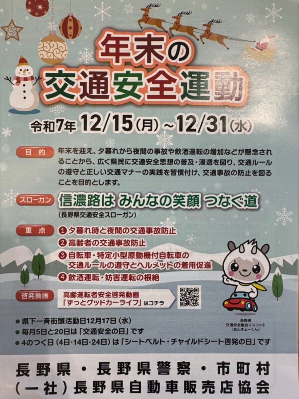 年末の交通安全運動~12/31(水) 2025年12月15日|東御店 こんにちは、東御店です^^ 本日、12/15(月)~12/31(水)まで ≪年末の交通安全運動≫ 期間となります😊 年末を迎え、 夕暮れから夜間の事故や飲酒運転の増加などが懸念されます。 交通安全思想の普及・浸透と、交通ルールーを守り、 交通マナーの実践を習慣付け、交通事故防止を図りましょう✨ 今日は朝早くから上田駅前にて≪出陣式≫がありました。 交通ルール・マナーを守り、安全運転でいきましょう🚙🚙🚙✨ Visited 13 times, 13 visit(s) today